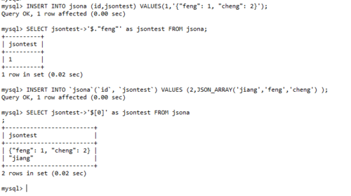 插入JSON数据时,可以直接插入格式化的JSON字符串,以下操作向表中插入一行带有JSON数据的数据: