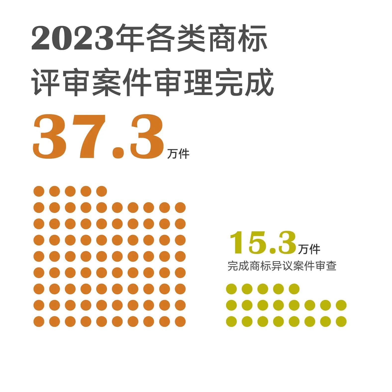 全年注册商标438.3万件。完成商标异议案件审查15.3万件。完成各类商标评审案件审理37.3万件。收到中国申请人马德里商标国际注册申请6196件。
