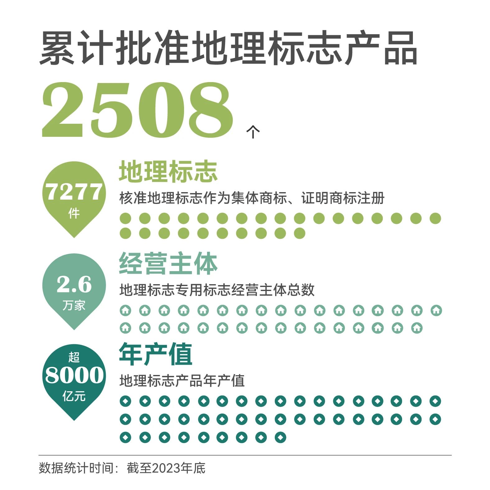 截至2023年底,我国累计批准地理标志产品2508个,核准地理标志作为集体商标、证明商标注册7277件,地理标志专用标志经营主体总数达2.6万家,地理标志产品年产值超过8000亿元。