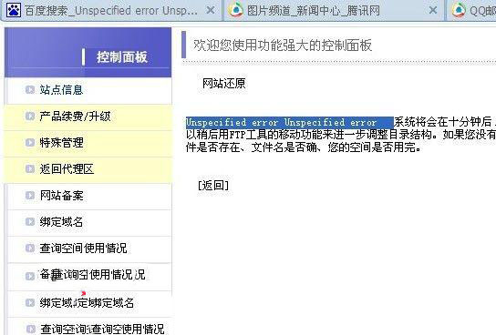 今天客户在线解压出现了Unspecified error 的错误,我以为是被控的权限,重新重置了受控端依然不行,访问被控依然正常,但http://受控域名/freehost.dll就出现错误,看样子不是IIS或者互相访问的问题了,肯定是某个星外组件出了问题;