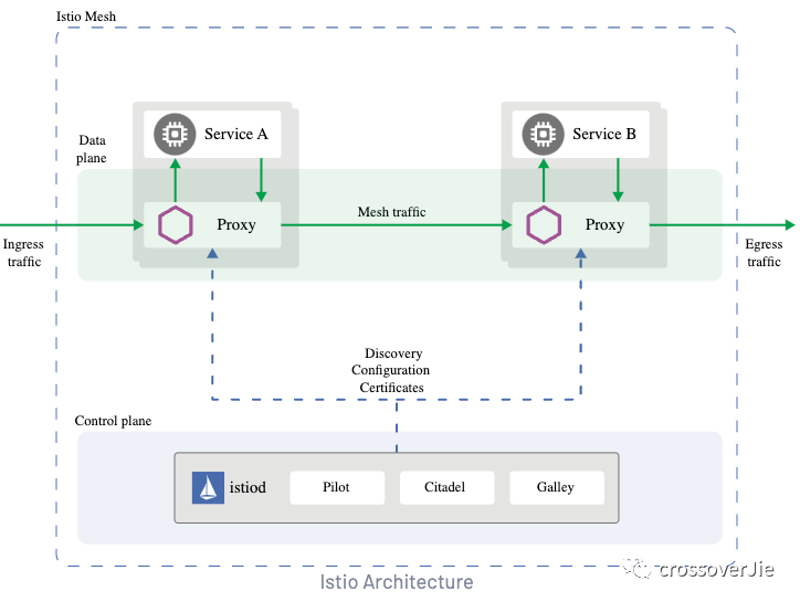 从 Istio 的流量模型中可以看出:Istio 支持管理集群的出入口请求(gateway),同时也支持管理集群内的 mesh 流量,也就是集群内服务之间的请求。