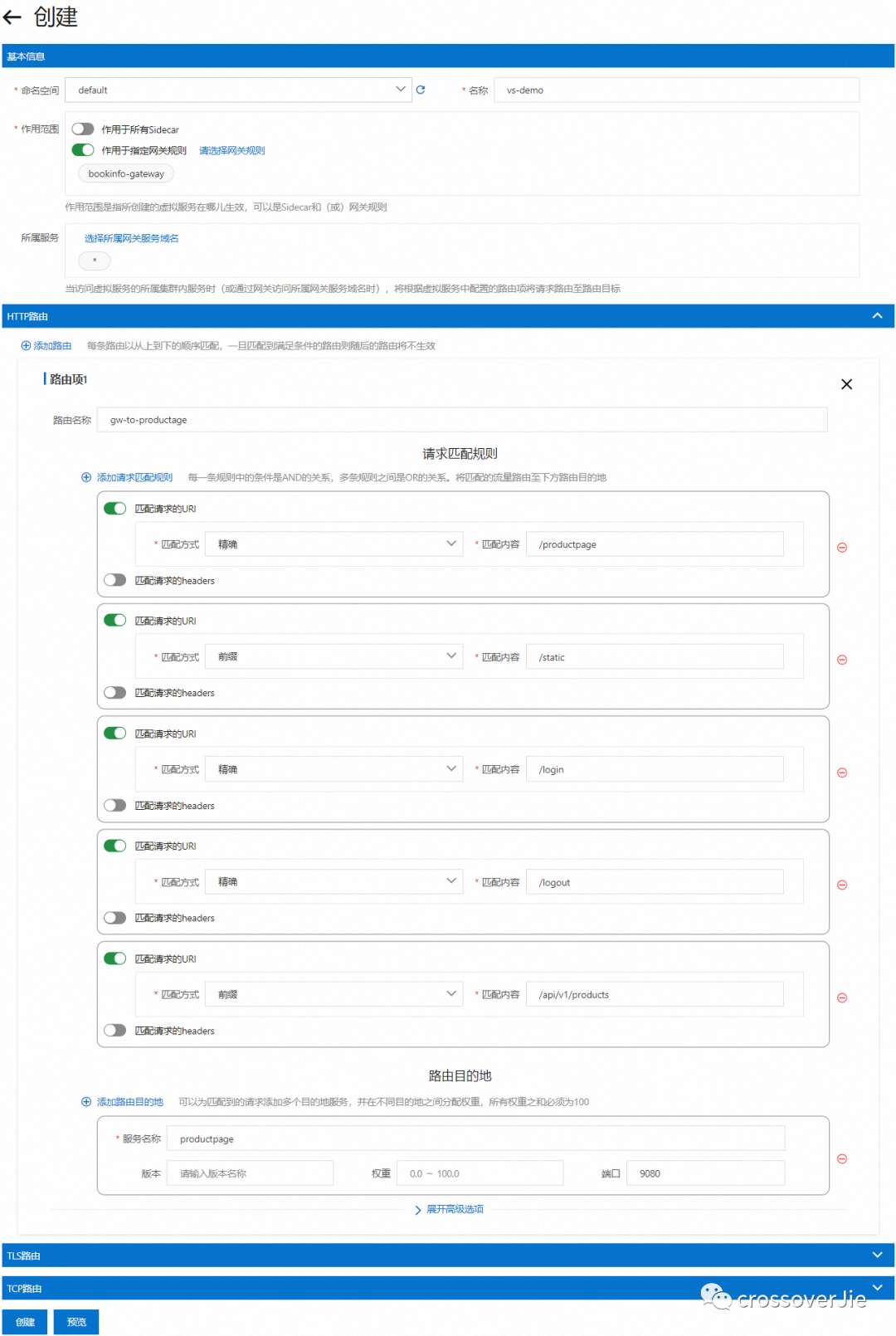 也就是这里 service 的名称,同时也支持配置为 host: k8s-combat-service-istio-mesh.default.svc.cluster.local,如果使用的简写Istio 会根据当前指定的 namespace 进行解析。