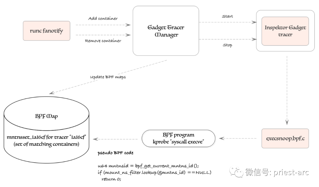 针对 Gadget Tracer Manager,作为一个负责管理正在运行的小工具和容器列表的组件,维护了一个记录当前活动的小工具和容器的清单。每个正在运行的小工具都与一个 eBPF 映射相关联,该映射中存储了要跟踪的容器的挂载命名空间标识符。这些标识符是根据传递给小工具的命名空间、标签、Pod名称等参数进行填充的。