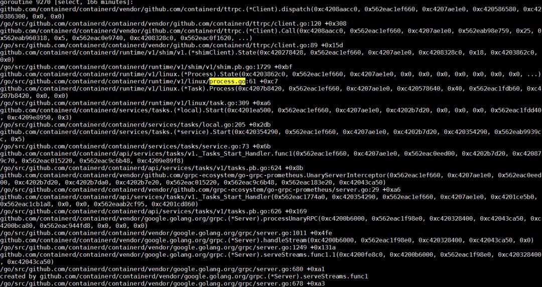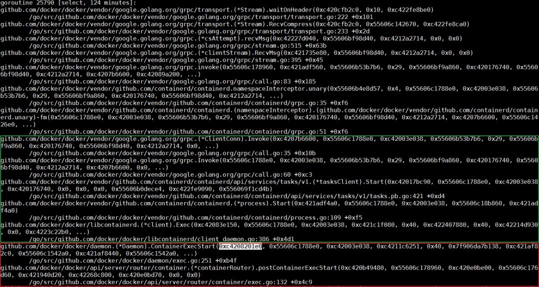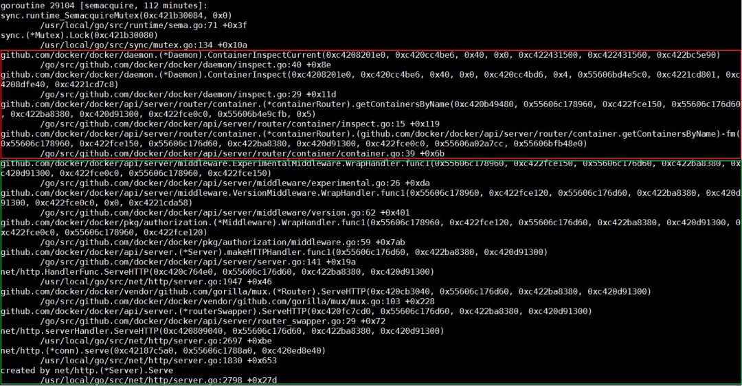 在这个问题中,既然 PLEG 认为容器运行是出了问题,我们需要先从 docker daemon 进程看起。我们可以使用 kill -USR1 命令发送 USR1 信号给 docker daemon,而 docker daemon 收到信号之后,会把其所有线程调用栈输出到文件 /var/run/docker 文件夹里。