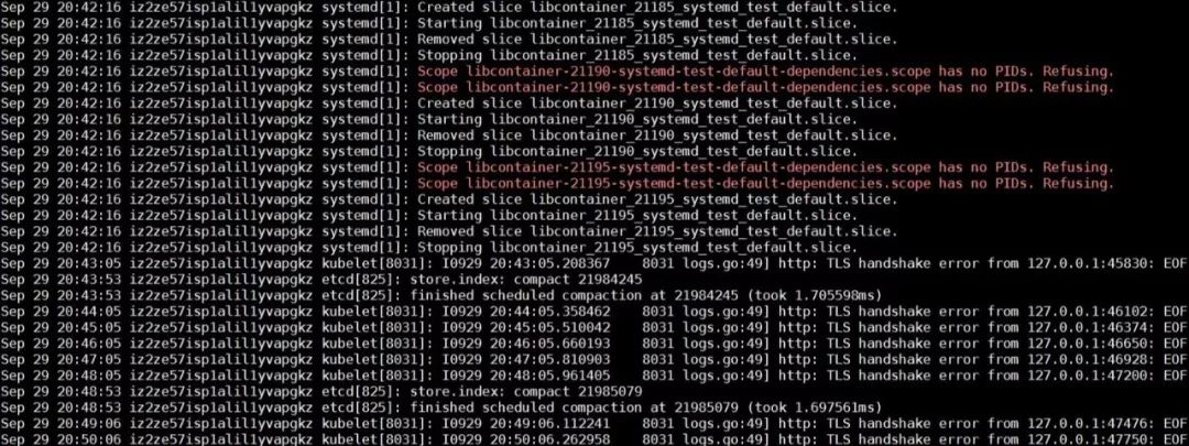 分析问题发生前后的系统日志,runC 在重复地跑一个 libcontainer_%d_systemd_test_default.slice 测试,这个测试非常频繁,但是当问题发生的时候,这个测试就停止了。