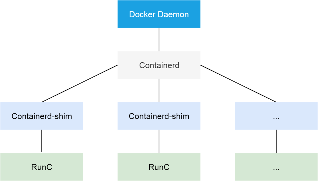 拆分之后,其包括 docker daemon,containerd,containerd-shim 以及 runC。组件 containerd 负责集群节点上容器的生命周期管理,并向上为 docker daemon 提供 gRPC 接口。