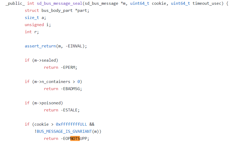在征求客户同意之后,下载 systemd 调试符号,挂载 gdb 到 systemd 上,在可疑的函数下断点,continue 继续执行。经过多次验证,发现 systemd 最终踩到了 sd_bus_message_seal 这个函数里的 EOPNOTSUPP 报错。