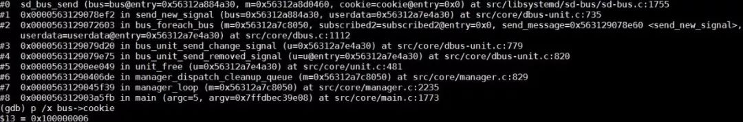 我们使用 gdb 打印出 dbus->cookie 这个值,可以很清楚看到,这个值超过了 0xffffffff。所以看起来,这个问题是 systemd 在加封过大量 message 之后,cookie 这个值 32 位溢出,新的消息不能被加封导致的。