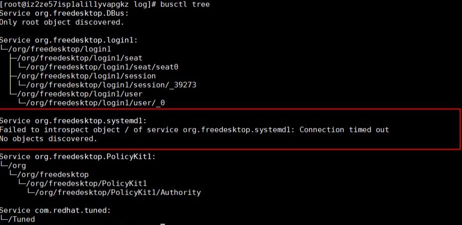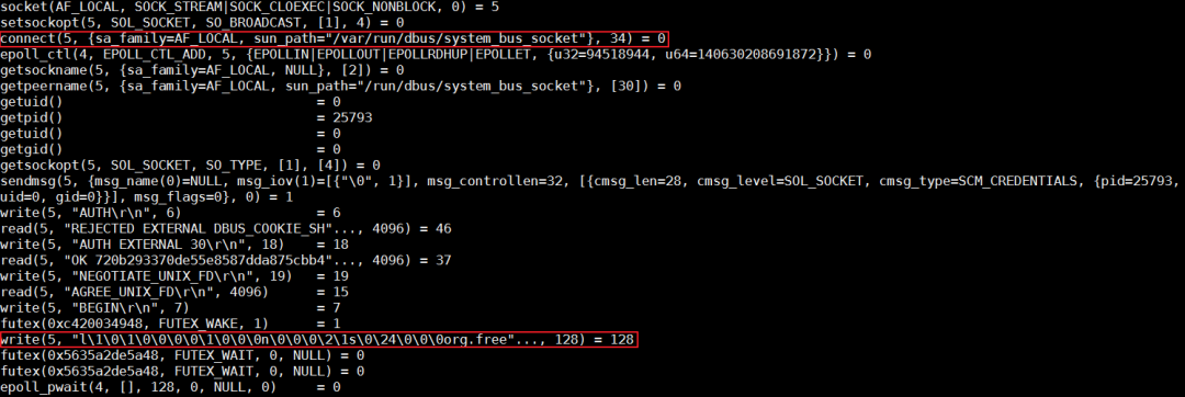 分析发现,runC 停在了向带有 org.free 字段的 dbus 写数据的地方。那什么是 dbus 呢?在 Linux 上,dbus 是一种进程间进行消息通信的机制。