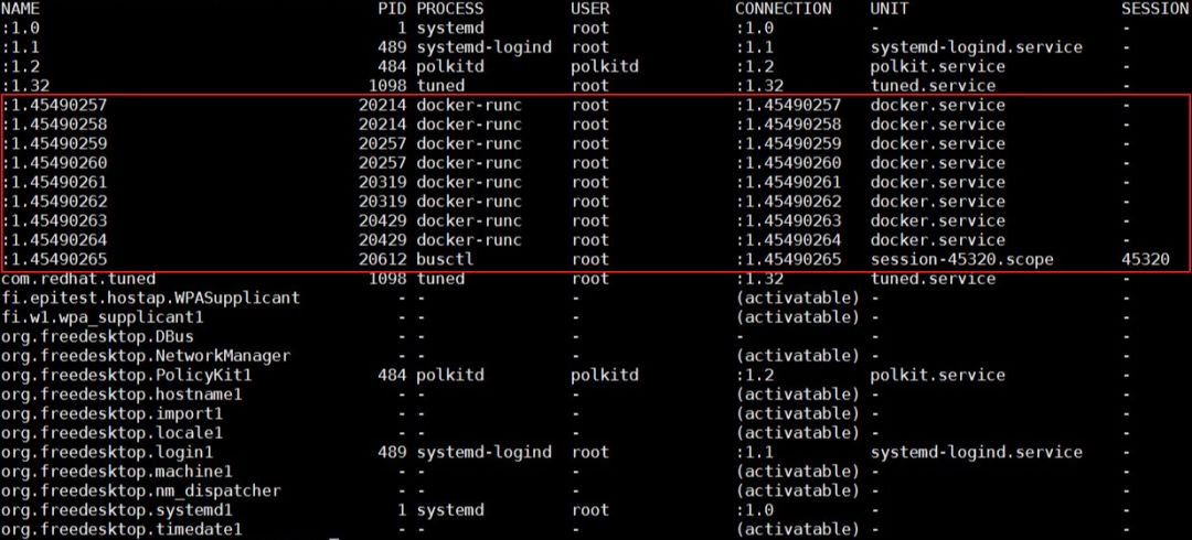 我们可以使用 busctl 命令列出系统现有的所有 bus。如下图,在问题发生的时候,我看到客户集群节点 Name 的编号非常大。所以我倾向于认为,dbus 某些相关的数据结构,比如 Name 耗尽了引起了这个问题。