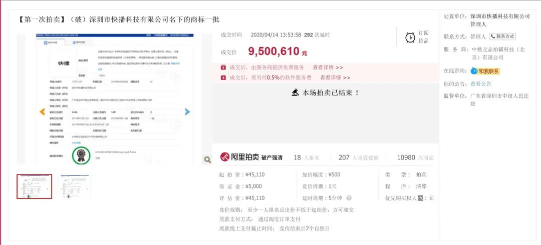 4月13日-14日,深圳市快播科技有限公司(快播公司)名下234项商标进行了公开拍卖。起拍价4.5万元,经过400多次竞买,最终以950万元成交。