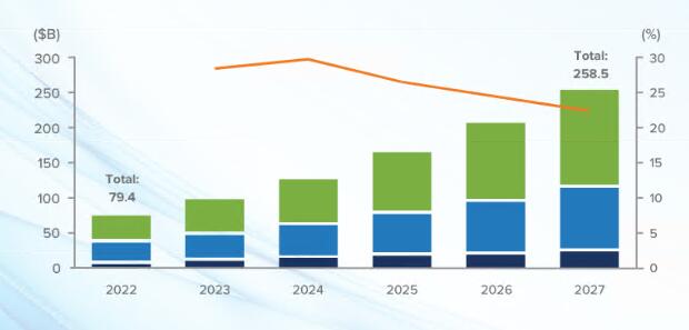 到2027年,全球主权云解决方案支出预计将达到2585亿美元。最近发布的2022-2027年全球主权云市场预测透露,在整个预测期内,主权云的总支出预计将创下26.6%的复合年增长率(CAGR)。
