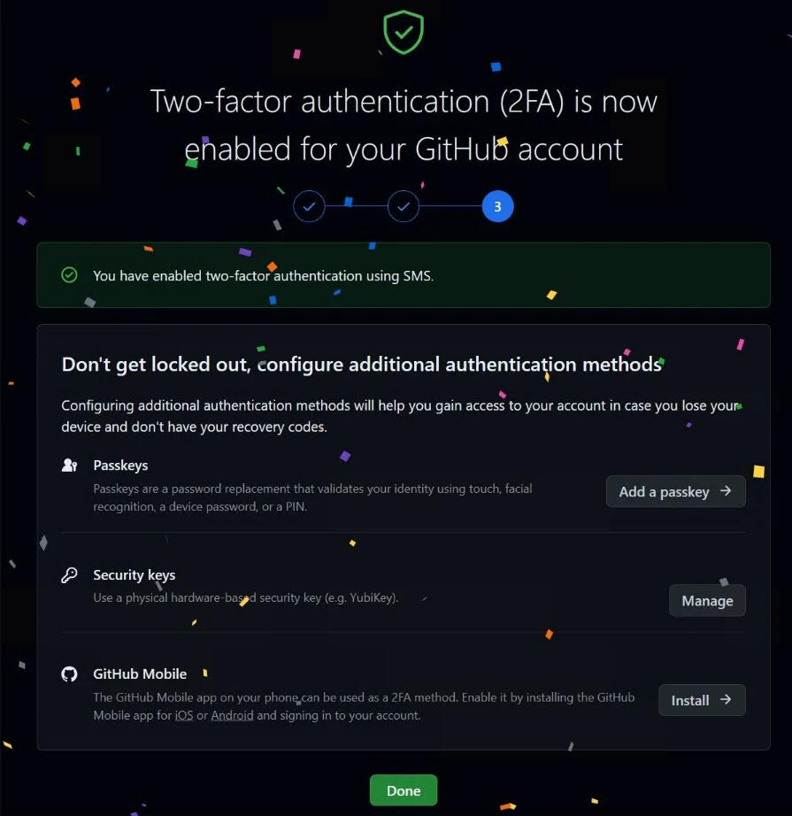 为了保证连续访问,建议至少激活其中两种方法。用户可以管理其2FA设置并在GitHub上的安全设置中分析其他方法。